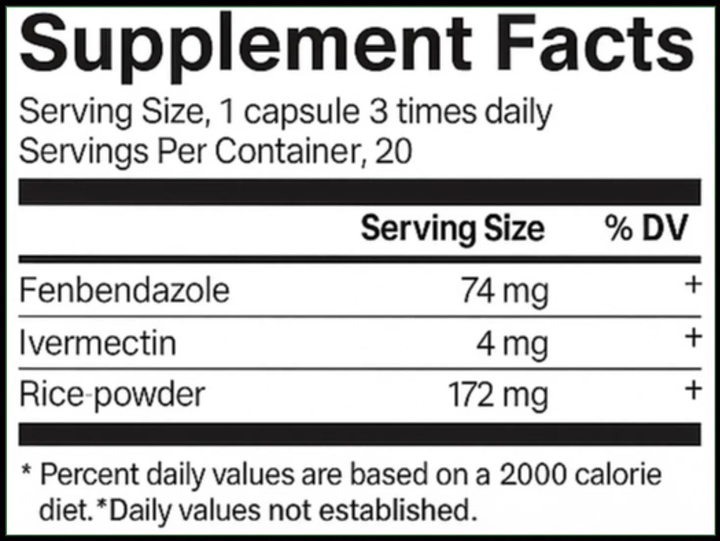 Unlike most supplements with long, unrecognisable ingredient lists, Deep Dive keeps it simple with just two ingredients: Fenbendazole and Ivermectin. (rice powder to fill up the rest of the capsule safely)